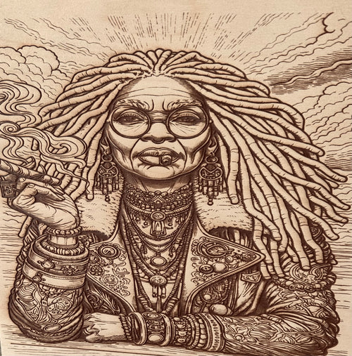 A Lady and Her Cigar — Laser Engraved Basswood (11x11)